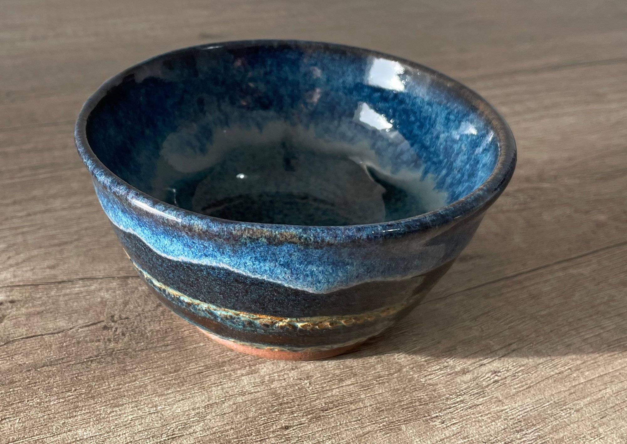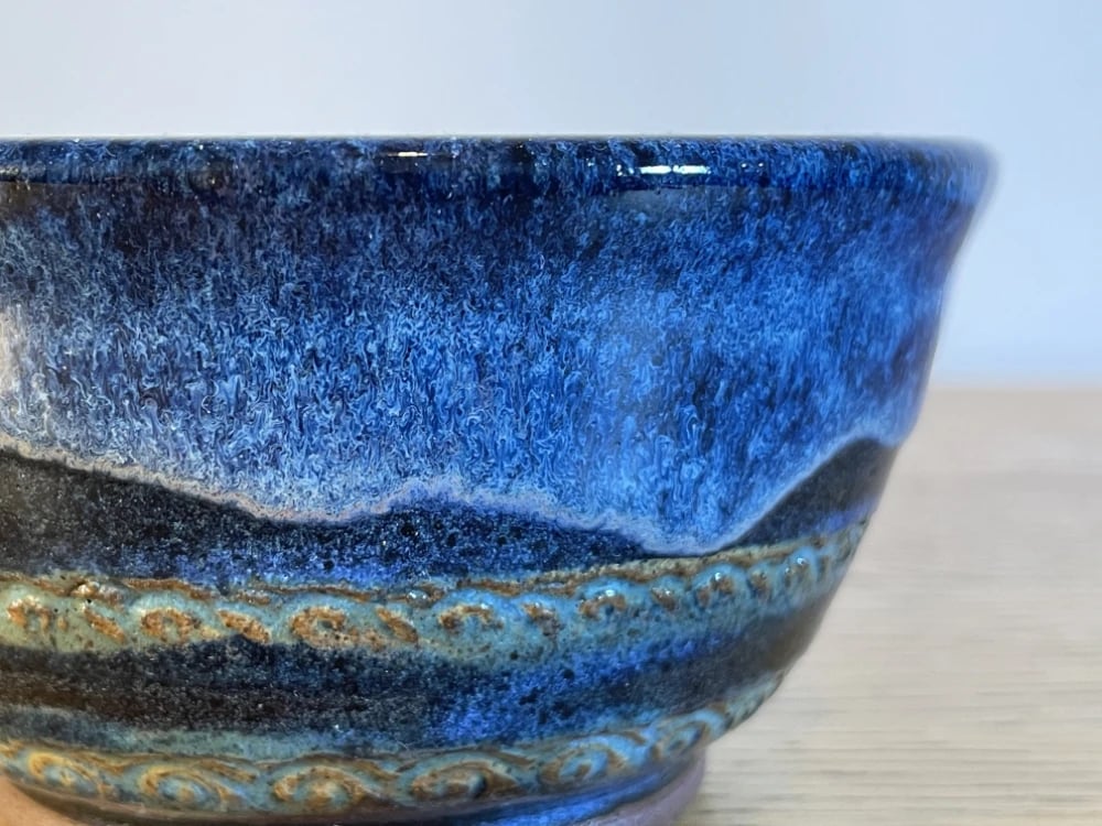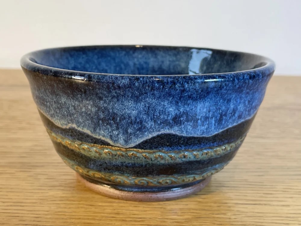 A medium handmade noodle or soup bowl with a winter night feel. Cold dark blues and a cool snowy splash are balanced by two gold weaving wave motifs, green by the sands and a rich dark mountain silhouette. Material: 100% clay. Microwave safe. Size: height 6cm, width 12.3cm. Weight: 429g.