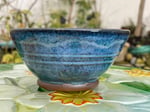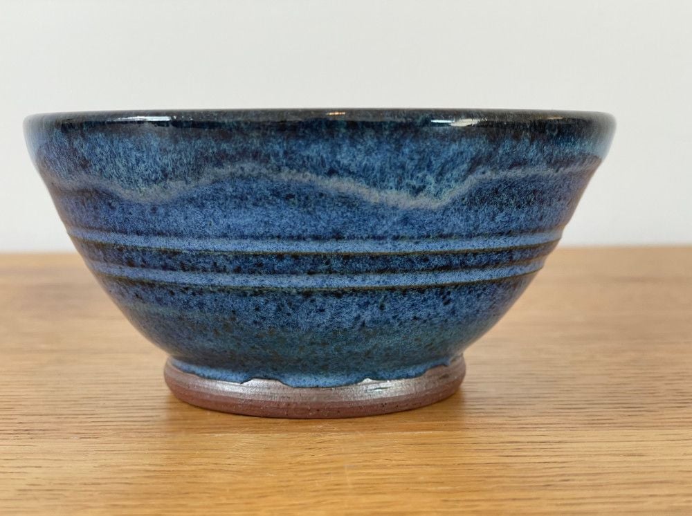 A medium noodle or soup bowl with winter mountain cloud mists and silvery blues. Indoors the colours mute to darker blues and turquoises, while different light reveals a whole kaleidoscope of colour. Material: 100% clay. Microwave safe. Size: height 6cm, width 12.7cm. Weight: 366g.