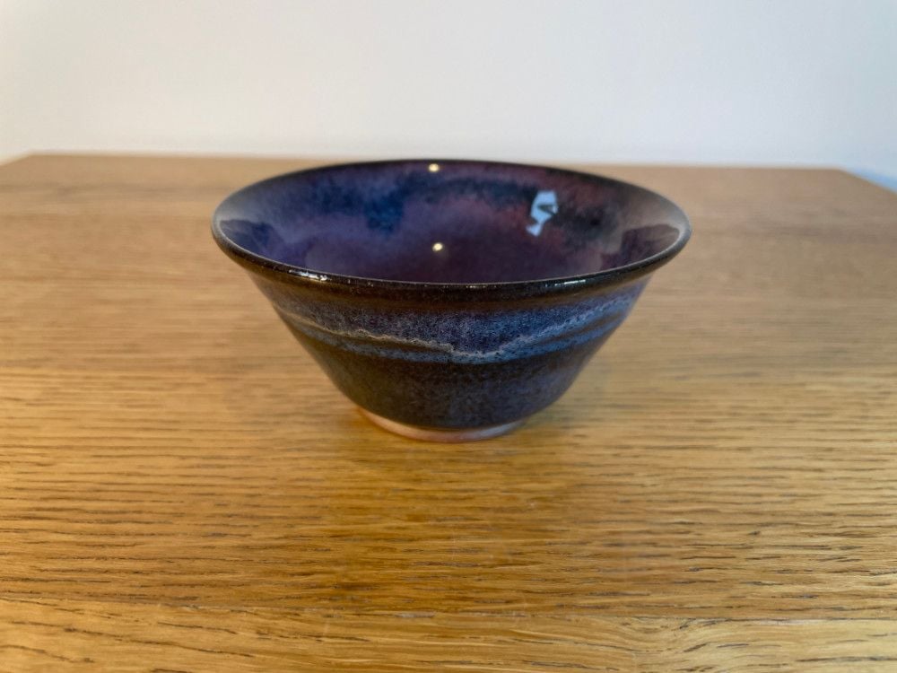 A small bowl with shiny purples, pinky reds and deep mauve glaze. Purple and creamy mountain outlines sit on a winter night across the Bay. Delicate and refined, it is ideal for dessert or even a cup of matcha tea. Material: 100% clay. Microwave safe. Size: height 5.2cm, width 10.8cm. Weight: 177g.